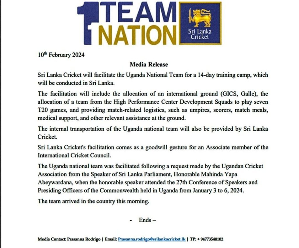 ශ්රී ලංකා ක්රිකට් ආයතනය විසින් උගන්ඩා ජාතික කණ්ඩායමට දින 14 ක පුහුණු කඳවුරක් සඳහා පහසුකම් සපයනු ලබන අතර, එය ශ්රී ලංකාවේදී පැවැත්වීමට නියමිත බව ශ්රී ලංකා ක්රිකට් ආයතනය නිවේදනය කළා.