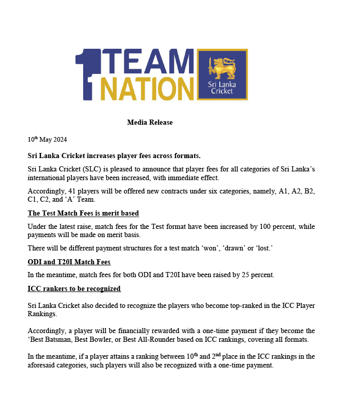 ඒමෙන්ම ජාත්යන්තර ක්රිකට් ශ්රේණිගත කිරීම්වල ඉහළ ස්ථානවලට පත්වල ශ්රී ලංකා ක්රීඩක ක්රීඩිකාවන් සඳහා මූල්ය ත්යාග ලබාදිමට ශ්රී ලංකා ක්රිකට් ආයතනය තීරණය කර තිබෙනවා.