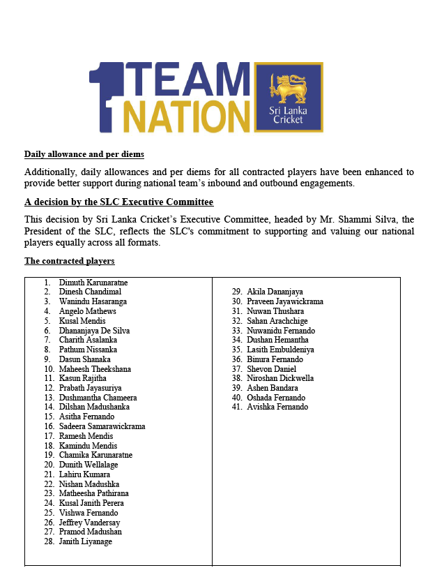 ඒ් කණ්ඩායමේ ක්රීඩකයින් ඒම වාර්ෂික කොන්ත්රාත්තුවට ඇතුළත් බවයි ශ්රී ලංකා ක්රිකට් ආයතනය නිවේදනය කළේ.