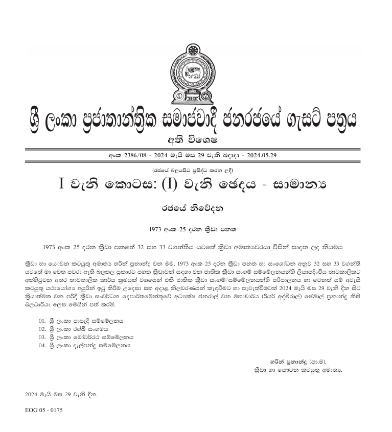 1973 අංක 25 දරන ක්රීඩා පනත හා සංශෝධන අනුව 32 සහ 33 වගන්ති යටතේ ක්රීඩා අමාත්ය හරීන් ප්රනාන්දු මහතාට පැවරී ඇති බලතල ප්රකාරව ජාතික ක්රීඩා සංගම් සම්මේලන 4ක ලියාපදිංචිය තාවකාලිකව අත්හිටුවමින් අමාත්යවරයා අතිවිශේෂ ගැසට් පත්රයක් ඊයේ නිකුත් කළා.