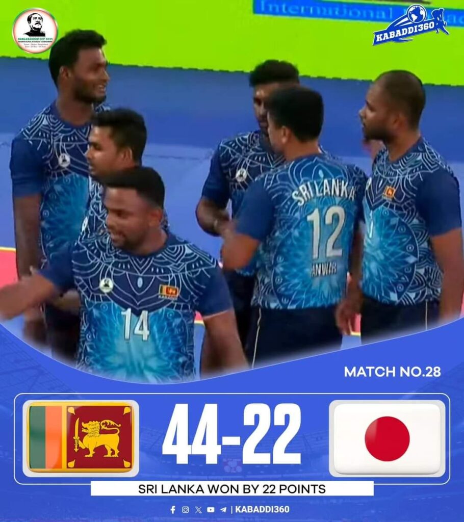 ඒ අනුව මෙම තරගය ලකුණු 44ට 22ක් ලෙස ජය ගත් ශ්රී ලංකා කබඩි කණ්ඩායම මෙවර තරගාවලියේ අඛණ්ව තුන්වැනි ජය වාර්තා කිරීමට සමත්වුණා.