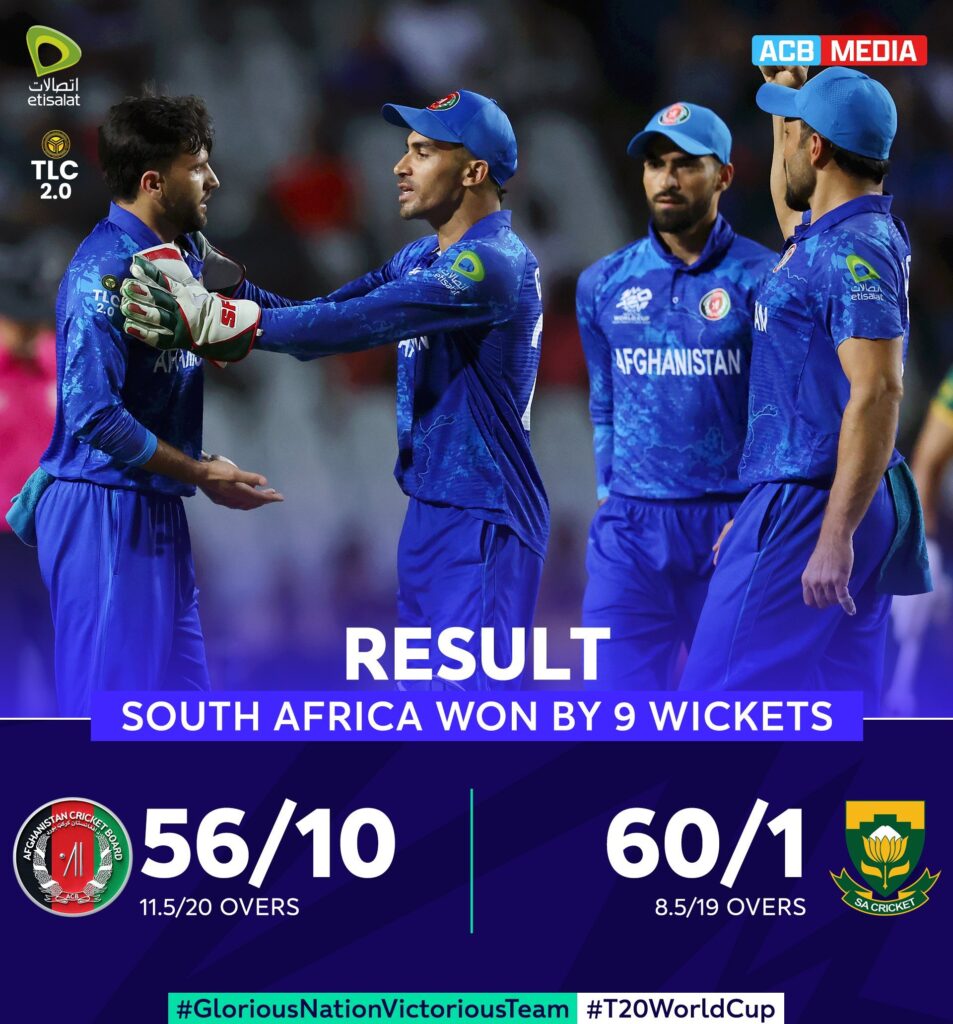 නමුත් වේලාසනින්ම ඇෆ්ගනිස්තාන කණ්ඩායමේ සැලසුම් අවුල්කළ දකුණු අප්රිකානු පන්දු බල ඇණිය පන්දුවාර 11යි පන්දු 5කදී ඇෆ්ගනිස්තාන සියලුම ක්රීඩකයින් ලකුණු 56කට දවාගත්තා.