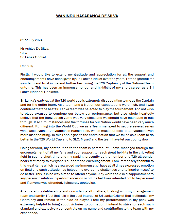 වනිඳු නායකත්වයෙන් ඉවත්වීමට හේතුව ඇතුළු කරුණු රැසක් එම ලිපියට ඇතුළත්.පසුගියදා අවසන් වූ 20-20 ලෝක කුසලානයේදී ශ්රී ලංකා පිල දැක්වූ දුර්වල ක්රීඩා විලාශය සම්බන්ධයෙන් වනිඳු එම ලිපිය මගින් සමාව ඉල්ලා තිබීම කැපී පෙනෙනවා.