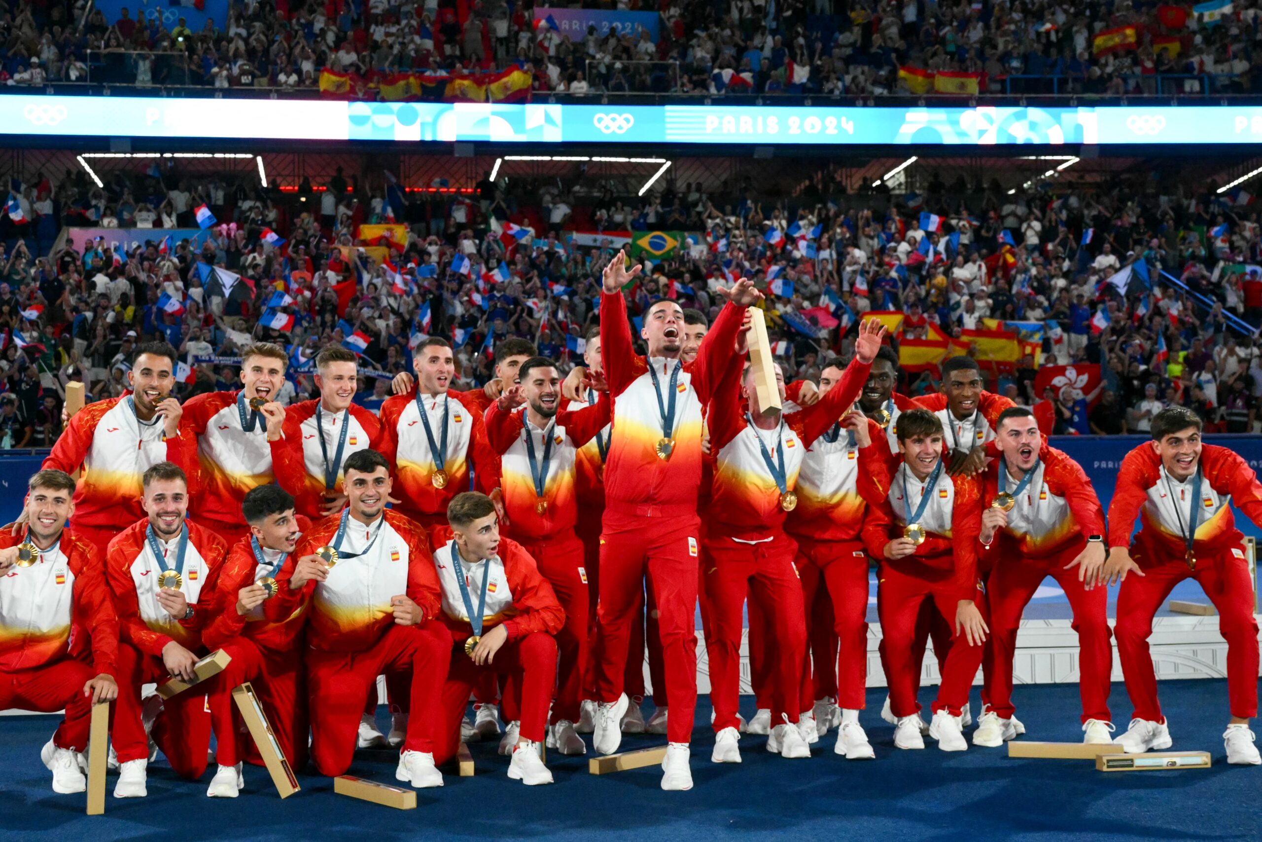 ඒ පැරිස් ඔලිම්පික් ක්රීඩා උලෙලේ පිරිමි පාපන්දු තරගාවලියේ අවසන් මහා තරගයේදී සත්කාරක ප්රංශය ගෝල 5ට 3ක් ලෙස පරාජය කරමින්.