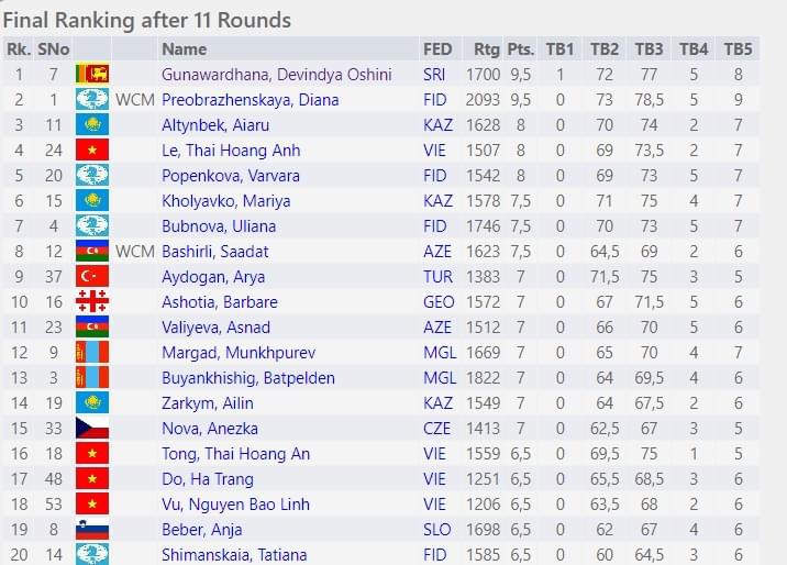 1700ක ලෝක ශ්රේණිගතකිරීම් අගයක් හිමි මෙම ක්රීඩිකාව තරගාවලිය ආරම්භයේ සිට ඉතාමත් දක්ෂ ලෙස තරග වැදුණා. එහි ප්රතිඵලයක් වශයෙන් ඇය තරග වට 11කින් ලකුණු 9.5ක් ලබාගෙන එම ඉසව්වේ රන් පදක්කම සිය රටට දිනාදුන්නා. එය ශ්රී ලංකාව මෙම තරගාවලි ඉතිහාසය තුළ දිනාගත් පළමු පදක්කම බවට පත් වුණා.