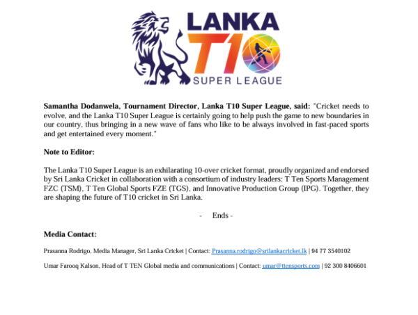 ශ්රී ලංකා ක්රිකට් ආයතනය පළමු වරට සංවිධාන කරන ලංකා ටී ටෙන් සුපර් ලීග් ක්රිකට් තරගාවලියේ ක්රීඩක කෙටුම්පත් කිරීමේ අවස්ථාව හෙවත් ක්රීඩකයින් තෝරා ගැනීමේ කටයුතු නොවැම්බර් 10 වැනිදා සිදු කිරීමට නියමිත බව ශ්රී ලංකා ක්රිකට් ආයතනය අද නිවේදනය කළා.