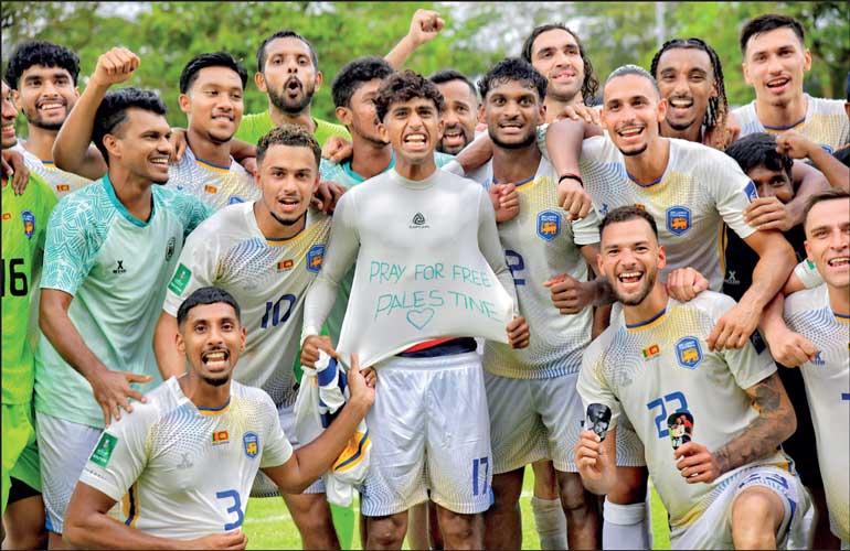 එහිදී ශ්රී ලංකා ක්රීඩකයින් එම ජයග්රහණය මෙලෙස සැමරූ අතර එහිදී සමූහ ඡායාරූපය ගන්නා අතරතුර පලස්තීනයට සහාය දක්වමින් ශ්රි ලංකා පාපන්දු ක්රීඩක මොහොමඩ් තිල්හාම් පණිවුඩයක් ප්රදර්ශනය කළා.