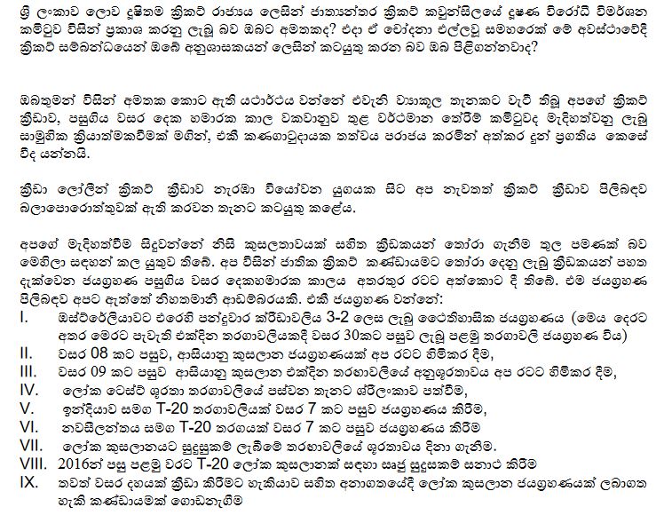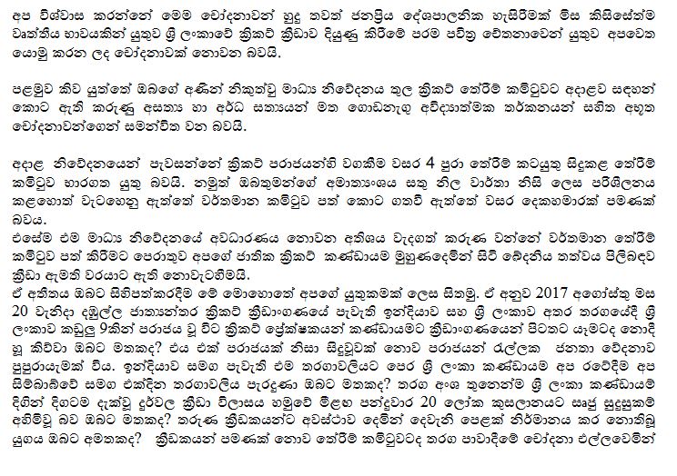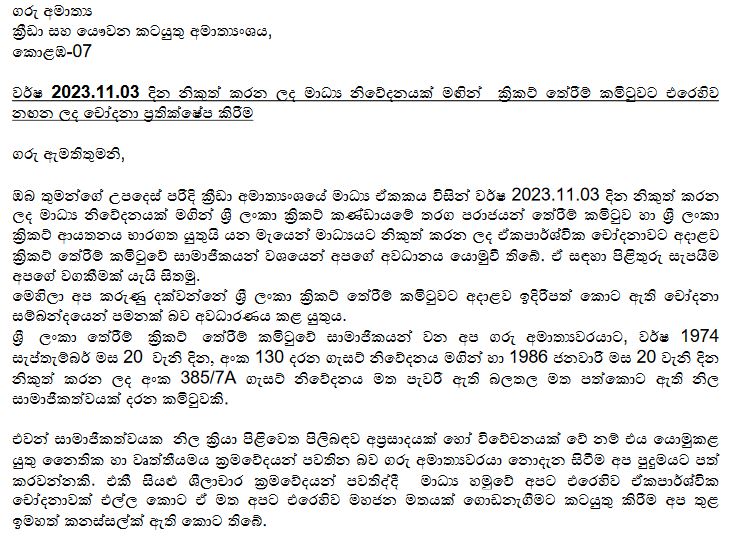 ක්රිකට් තේරීම් කමිටුව ක්රීඩා අමාත්ය රොෂාන් රණසිිංහ වෙත යොමු කළ ලිපිය පහතින්.