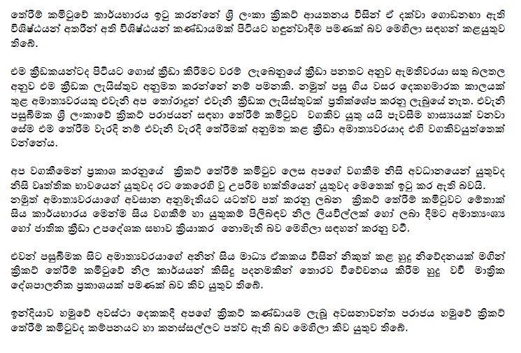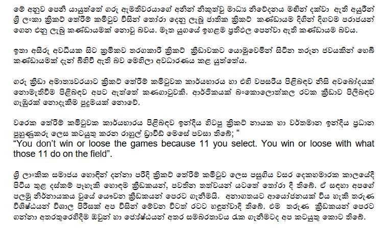 මෙහි පිටපත් ජනාධිපතිවරයාට සහ සියලු මාධ්ය වෙතද යොමු කිරීමට ක්රිකට් තේරීම් කමිටුව පියවර ගෙන තිබෙනවා.