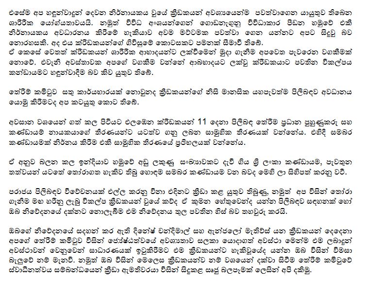 එම ලිපිය පිටු 4කින් සමන්විත වන අතර සිය නිල කාලය තුළ සිදු කළ කාර්ය සහ ඉන්දීයාව හමුවේ ලද පරාජය සම්බන්ධයෙන් ක්රිකට් තේරීම් කමිටුව මෙහිදී කරුණු දක්වා තිබෙනවා.