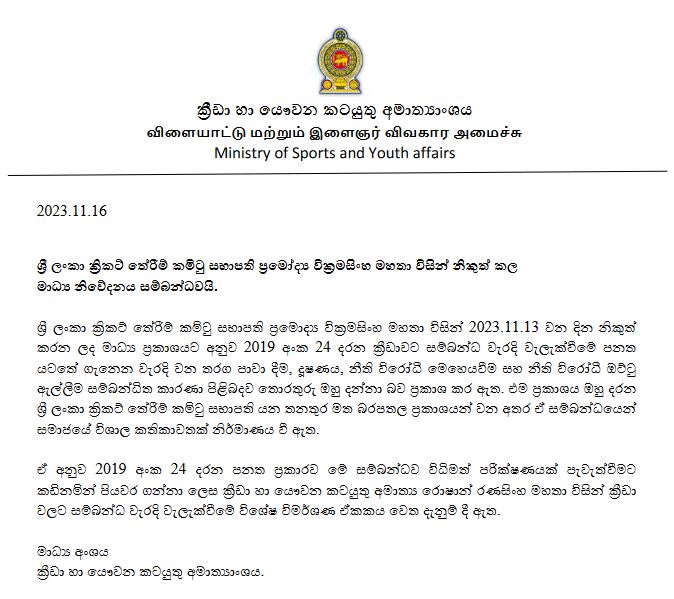 ක්රිකට් තේරීම් කමිටු සභාපති ප්රමෝද්ය වික්රමසිංහ පසුගිය 13වනදා නිකුත් කරන ලද මාධ්ය ප්රකාශයකට අදාළව අමාත්යවරයා මෙම දැනුම්දීම සිදු කළ බවයි ක්රීඩා අමාත්යංශය නිවේදනයක් නිකුත් කරමින් පැවසුවේ.