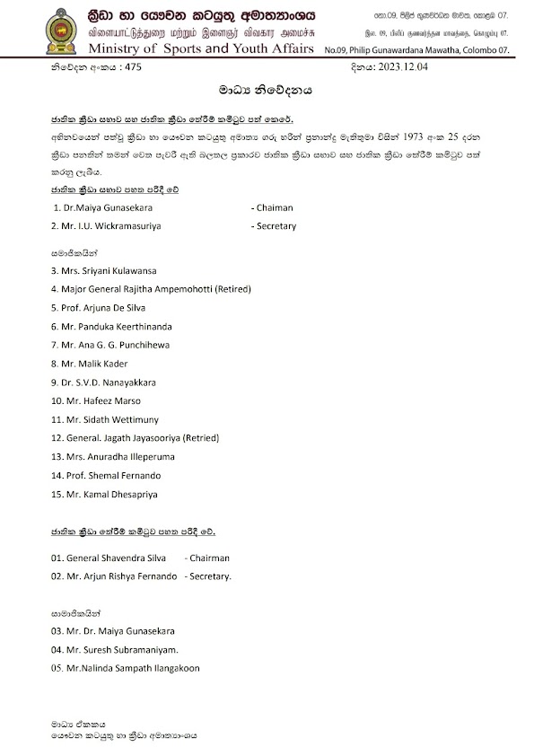 ඒ අනුව ක්රීඩා අමාත්ය හරීන් ප්රනාන්දු මහතා විසින් එම කවුන්සිලය සඳහා සාමාජිකයින් 15ක් පත්කර ඇති බවයි ක්රීඩා අමාත්යංශය නිවේදනය කළේ.