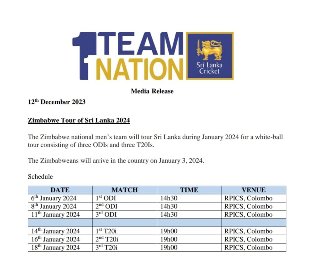 ශ්රී ලංකා-සිම්බාබ්වේ එක්දින තරගාවලිය ජනවාරි 6 වැනිදා ද, විස්සයි විස්ස තරගාවලිය ජනවාරි 14 වැනිදා ද ආරම්භ වීමට නියමිත අතර සියලු තරග කොළඹ ආර්.ප්රේමදාස ක්රීඩාංගනයේ දී පැවැත්වීමට ශ්රී ලංකා ක්රිකට් ආයතනය තීරණය කර තිබෙනවා.