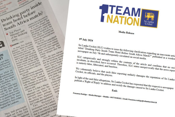 රී ලංකා ක්රිකට් ආයතනය පෙන්වා දෙන්නේ ලිපියේ අන්තර්ගතය තම ආයතනය ප්රතික්ෂේප කරන බවයි අදාළ පුවතෙයි වාර්තා කර ඇති පරිදි ඒවැනි සිදුවීම් කිසිවක් සිදුවී නොමැති බව තහවුරු කරන බවද එම නිවේදනයේ දැක්වෙනවා.
